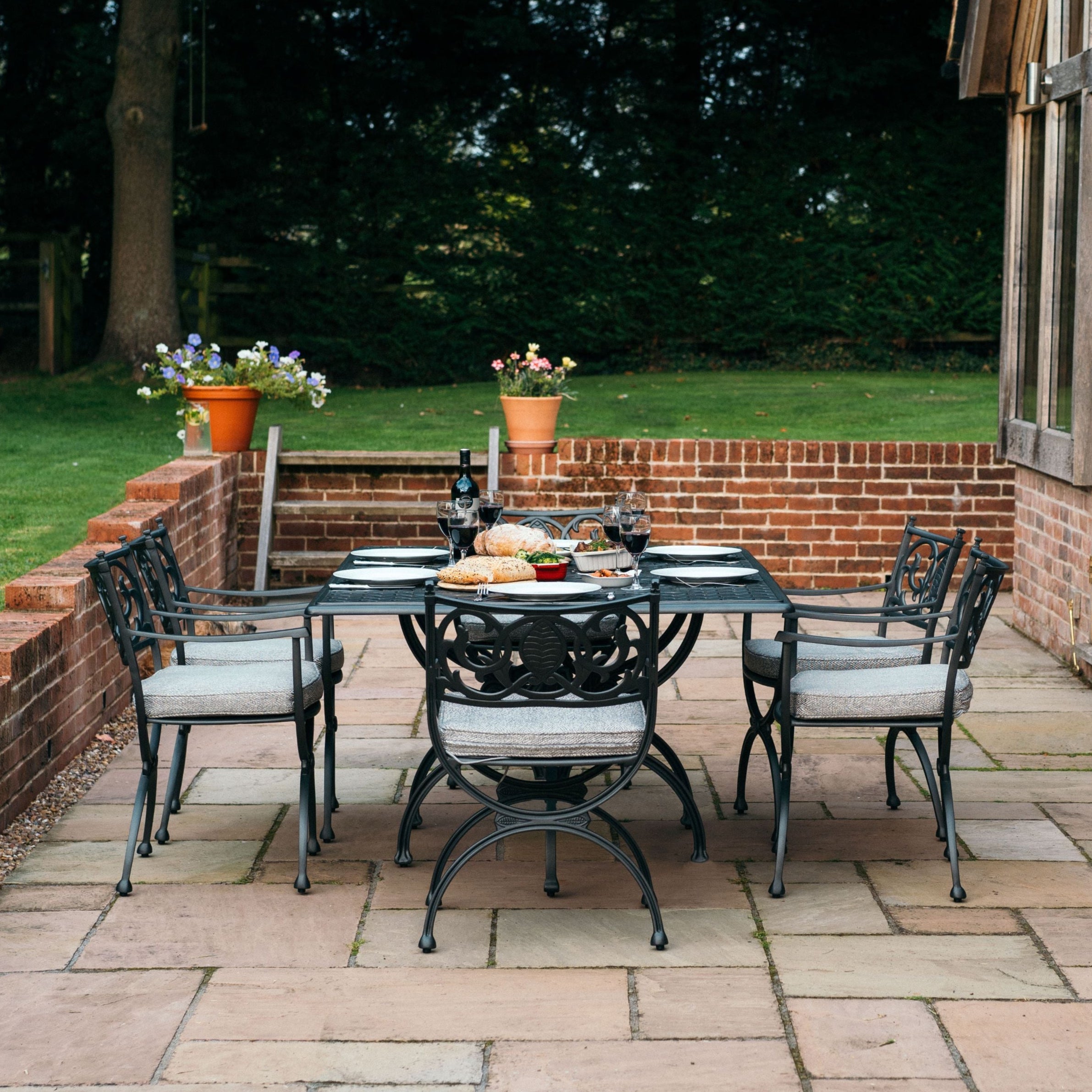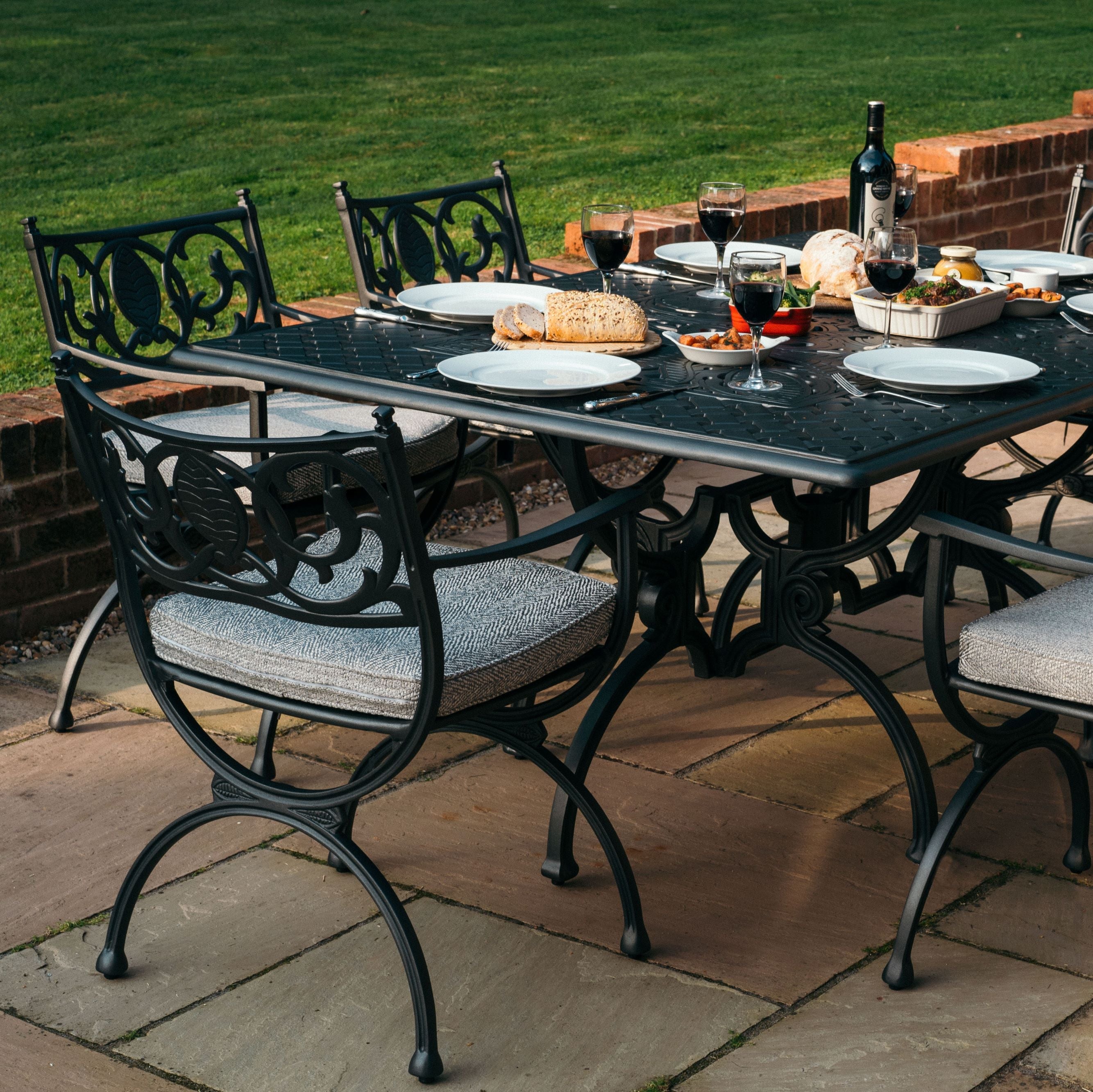 This 175cm long table is a beautiful piece of furniture in its own right, extremely robust, movable with two people and designed to blend into its environment. It is designed to seat 6 and allows you and your friends plenty of room in which to enjoy each other’s company. The tabletop has real depth accentuating the design and means that it is extremely strong.