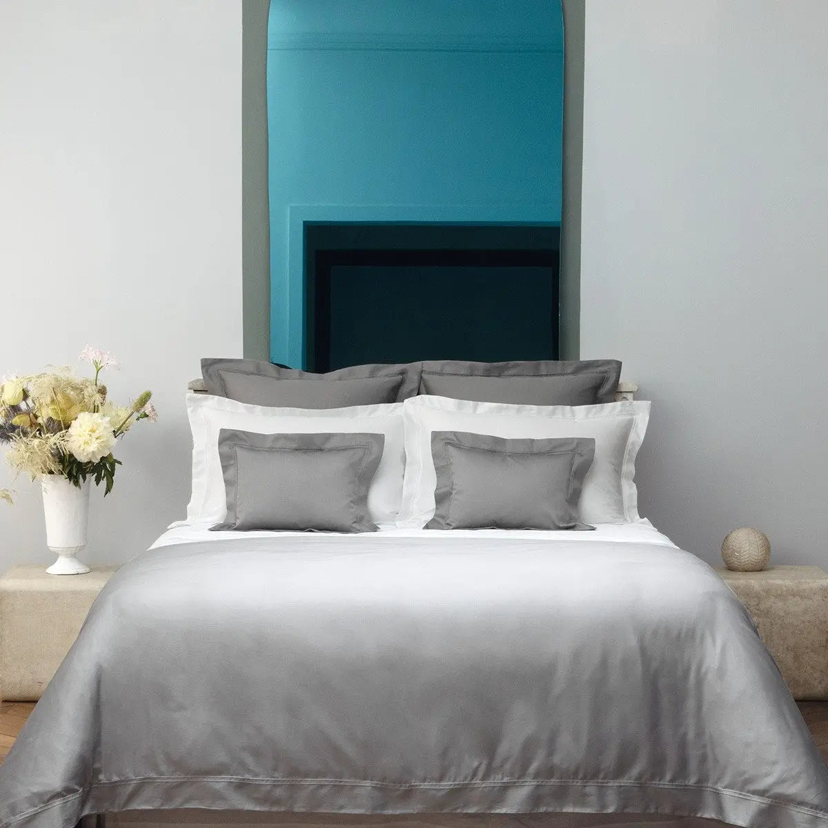 A refined platinum grey with a quiet glow. The Triomphe Platine collection by Yves Delorme is crafted from luminous cotton sateen whose silky surface enhances the subtle depth of colour.