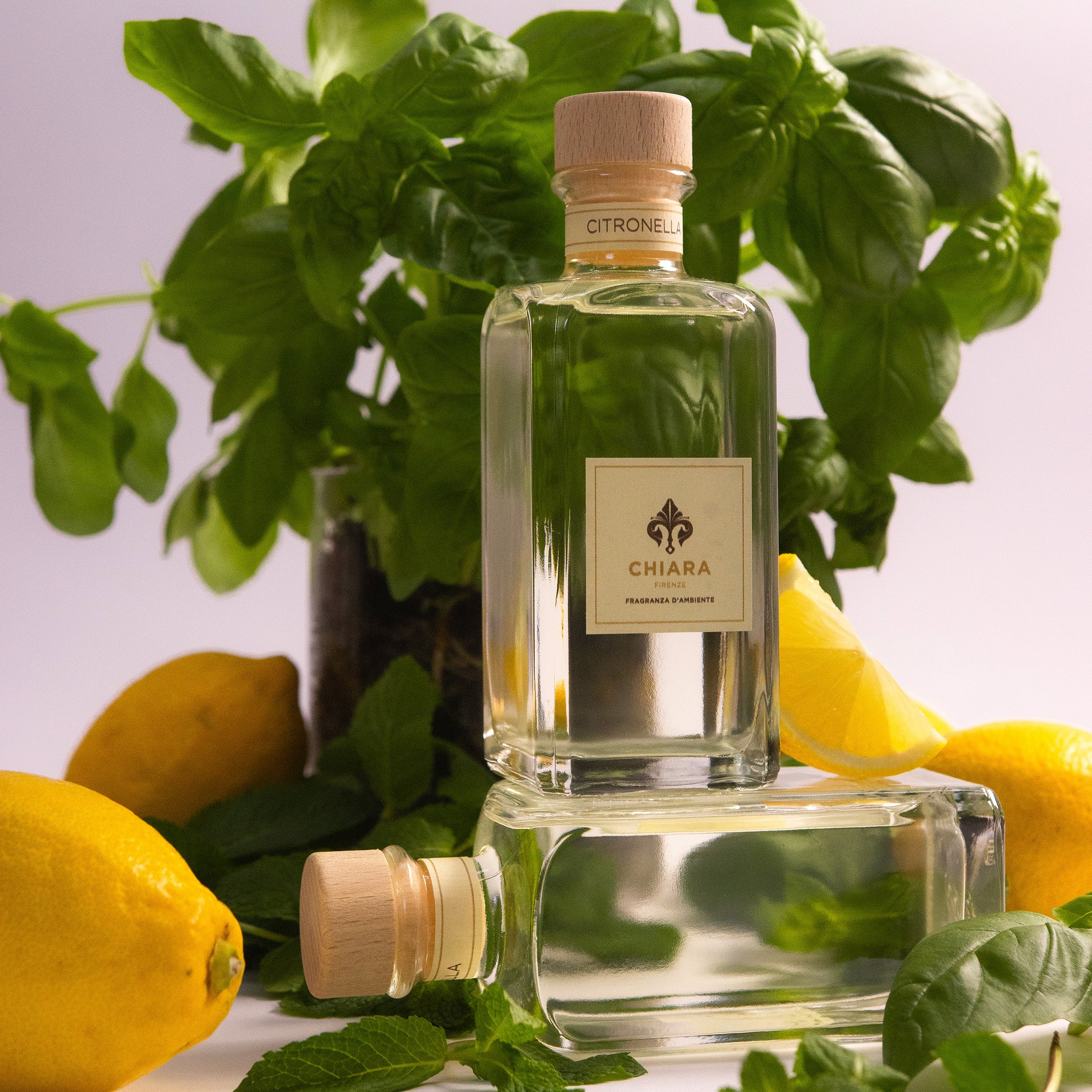 A light, fresh scent that leads the senses into the midst of greenery. Aromatic notes of Peppermint, Lemongrass, Basil and Vetiver for a pleasant and useful fragrance to make our summer more serene.