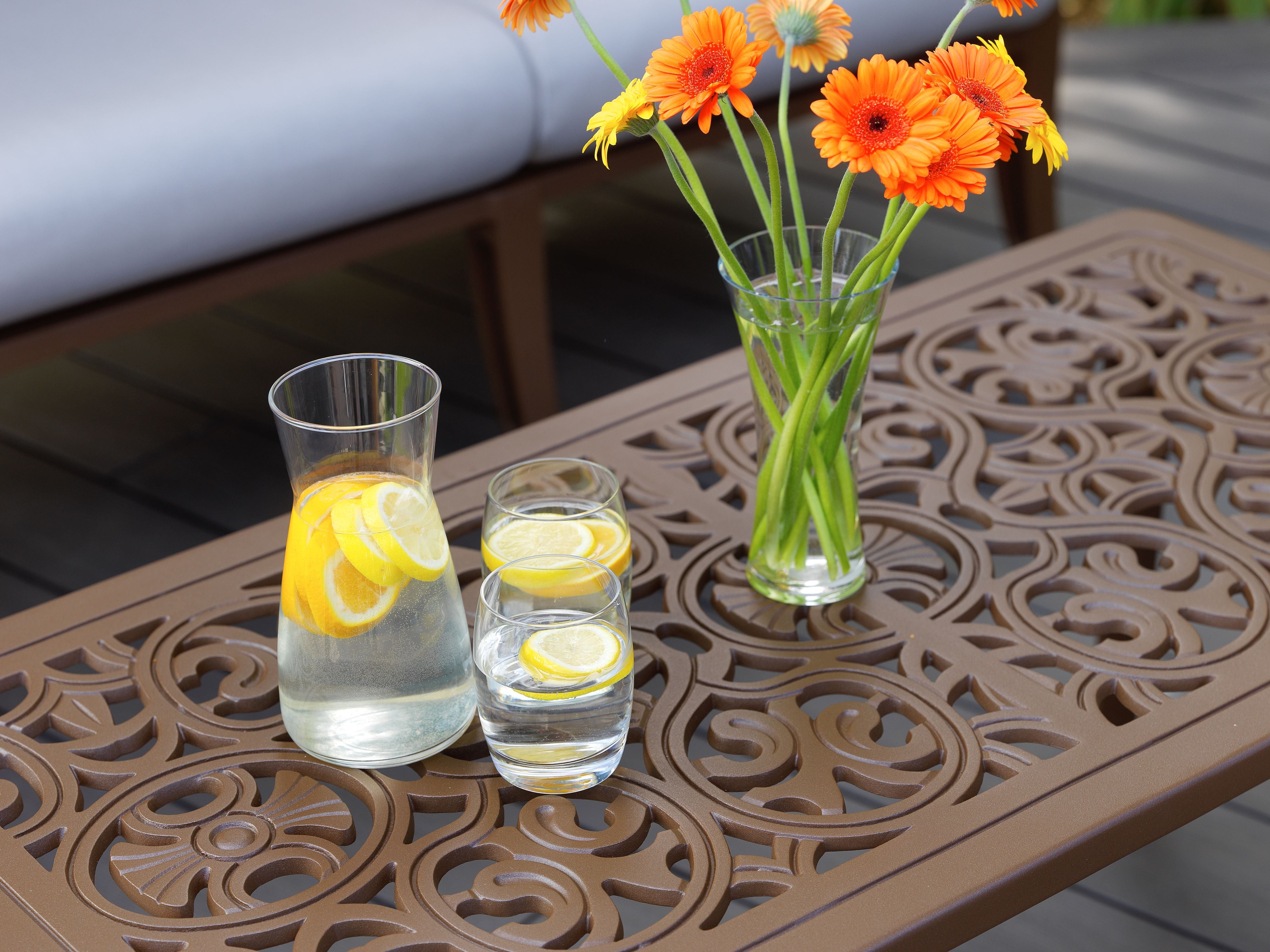 Our small Scroll coffee table has a deep cast top allowing the depth of the stunning Scroll design to stand out. Paired with our Scroll lounge chair, lounger or sofa, it is the perfect addition to your outdoor space, and looks great with a glass of wine placed on top.