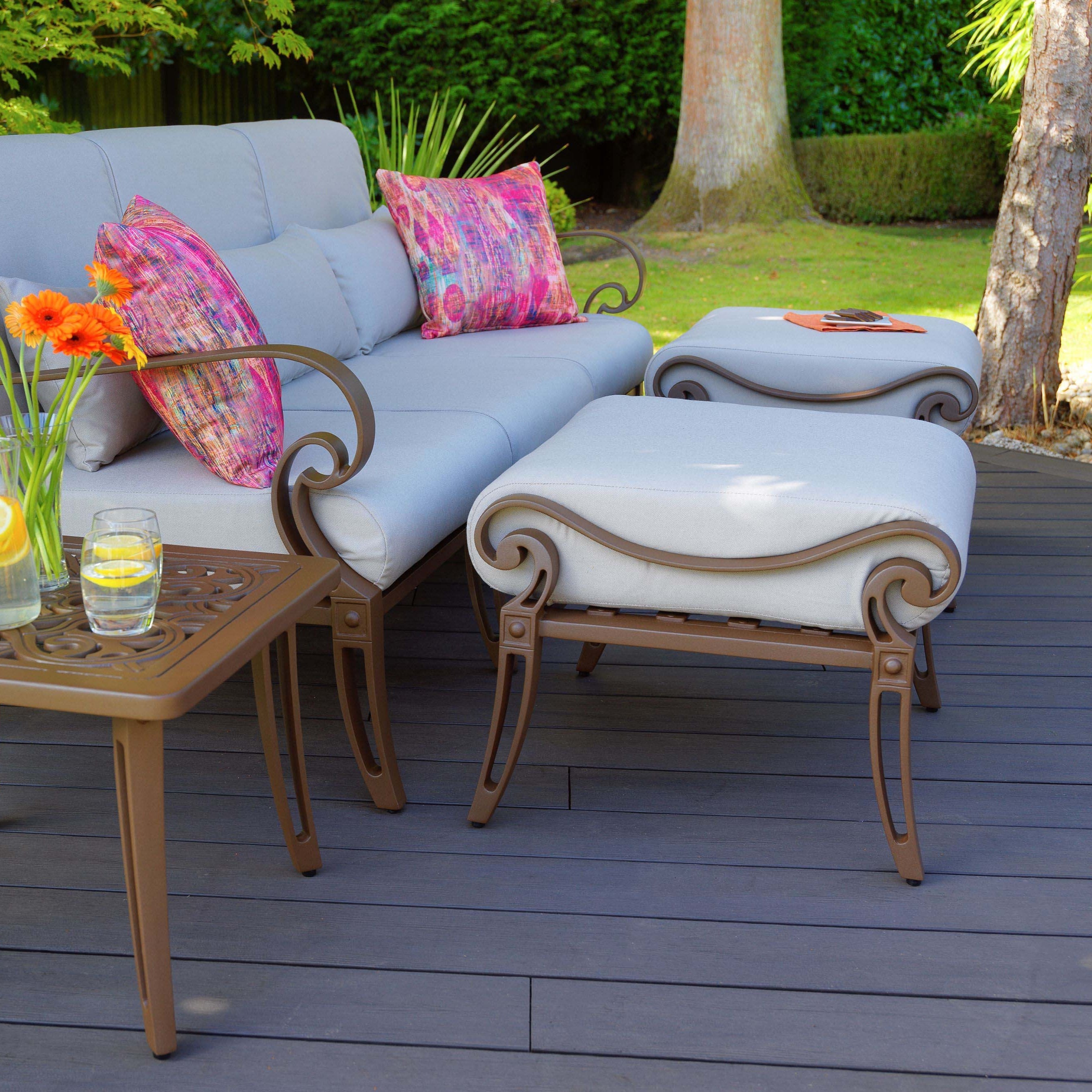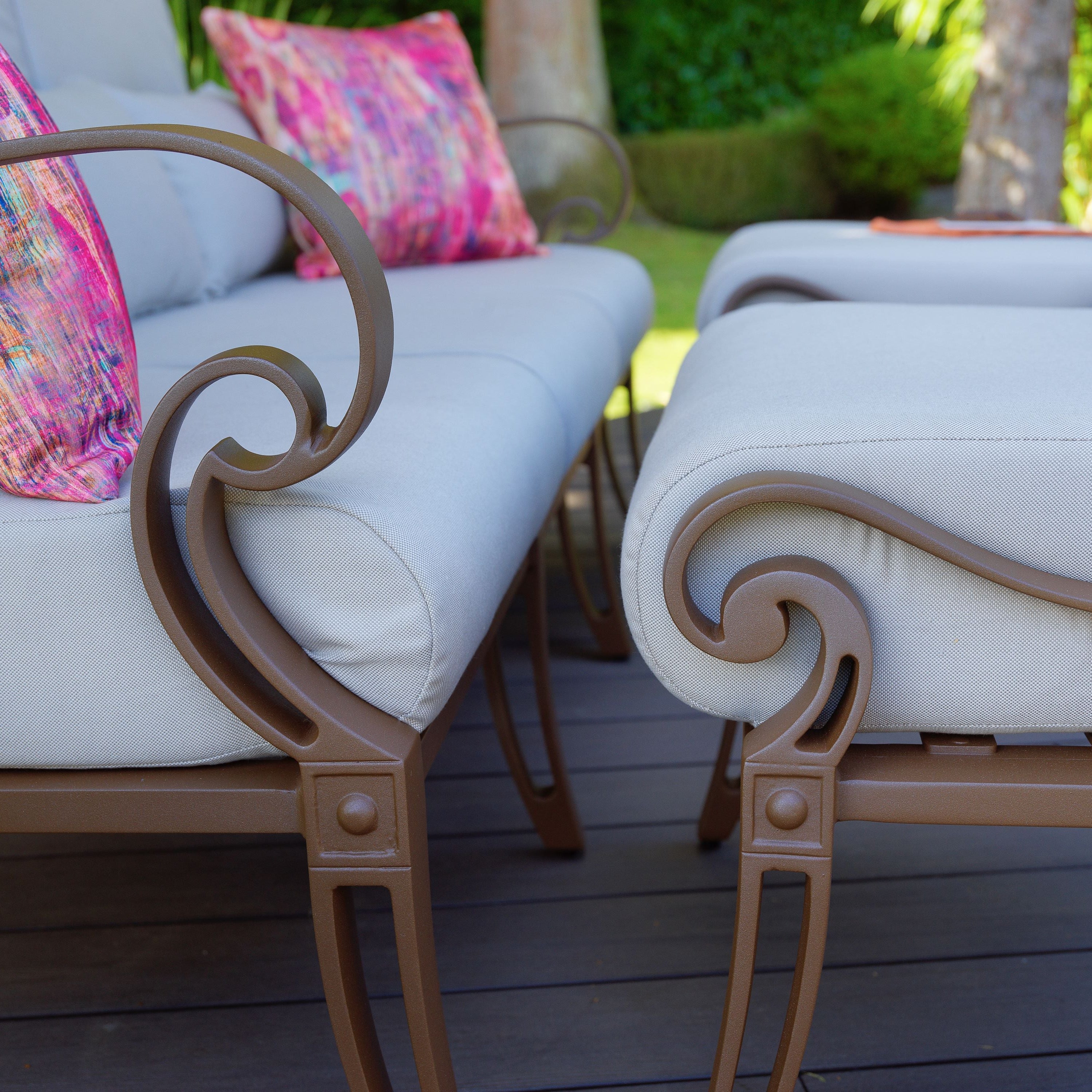 Our Scroll lounge chairs, sofas & ottomans are designed to provide you with stunning furniture that allows you to create your own serene outdoor relaxation area. Each item comes with deep filled foam cushions for extreme comfort, allowing you to appreciate them all day if desired. These items are light enough so they can be moved during the day if required. For blissful comfort they are unbeatable.